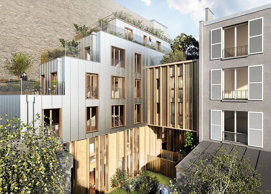 La forme en « T » de l‘immeuble permet d’éviter « l’effet barre » et anime cet espace enclavé et tout en longueur. Le volume perpendiculaire est construit comme un pont suspendu qui comprend un toit terrasse sur lequel domine un jardin planté. Le visiteur, l’habitant ou le voisinage auront dès l’entrée une vision sur plusieurs niveaux de jardins : celui en premier plan de l'entrée, celui en fond de cour laissé visible par le volume en hauteur et les terrasses en escalier elles-mêmes plantées.